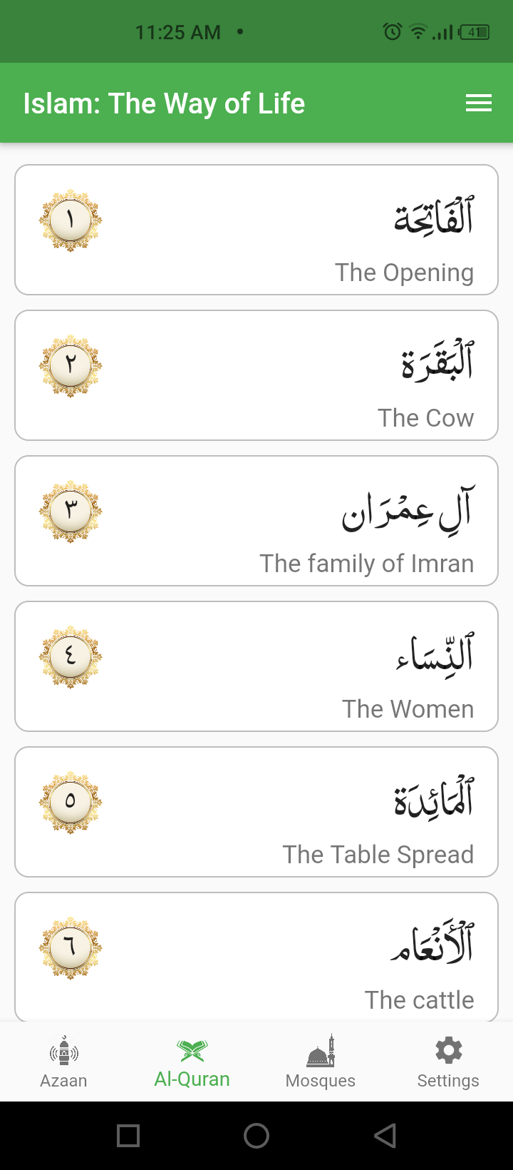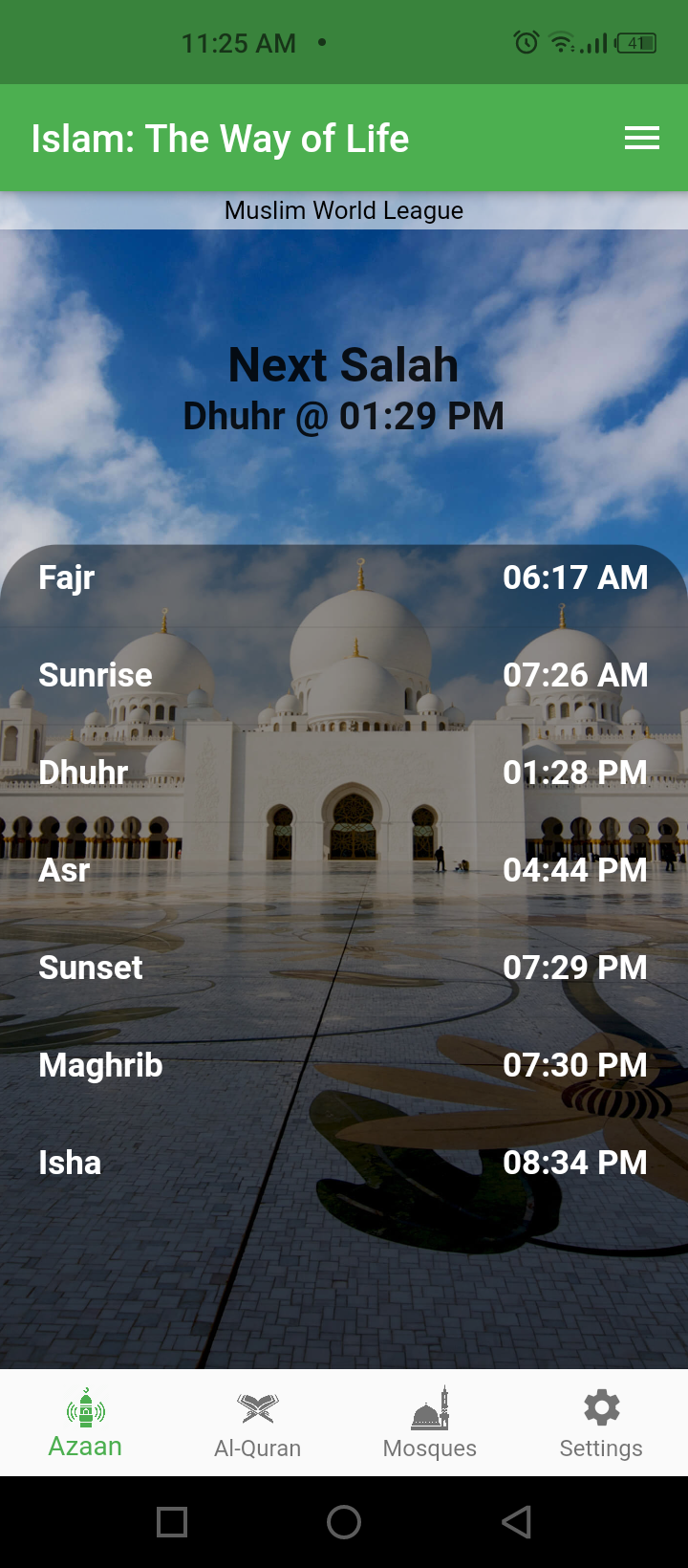 Islam: The Way of Life is a mobile application developed in Flutter. It has Athan, Qibla, Al-Quran with bookmarks and Mosques lookup in a set radius. Al-Quran comes with 5 translations with 4 language options (English, Bengali, Urdu, and Malay). Athan has different calculation methods to select as well.